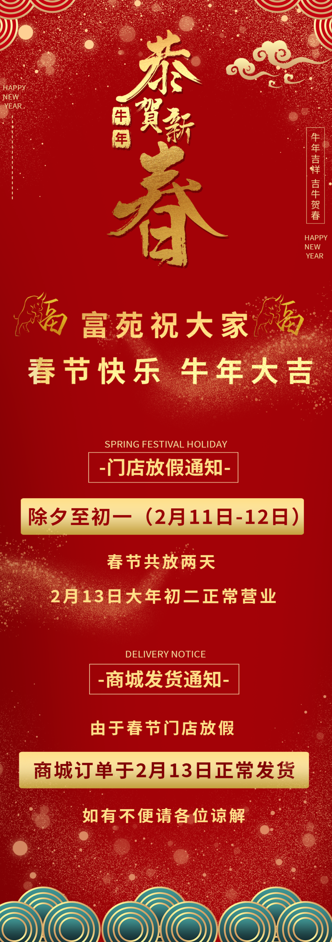 【概要描述】牛年吉祥,吉牛賀春!富苑除夕&初一放假兩天