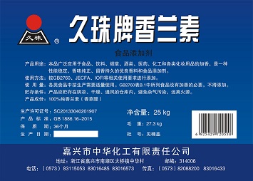 三.用途:香蘭素可廣泛應(yīng)用于食用、煙用與日用產(chǎn)品的加香,同時也是重要的精細(xì)化工產(chǎn)品。用作食品添加劑時,請按GB 2760要求使用。