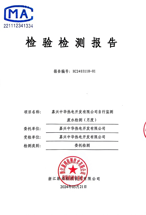 報(bào)告名稱:2024年中華熱電5月廢水檢測(cè)報(bào)告
