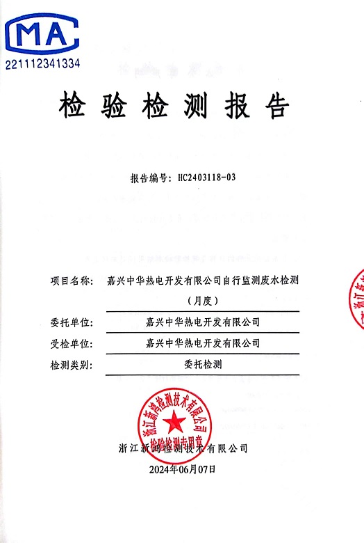 報告名稱:2024年中華熱電6月廢水檢測報告